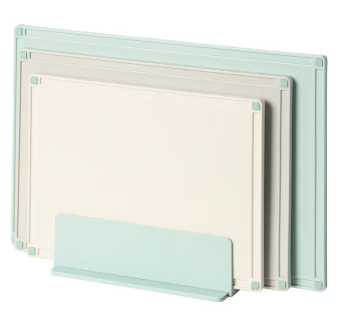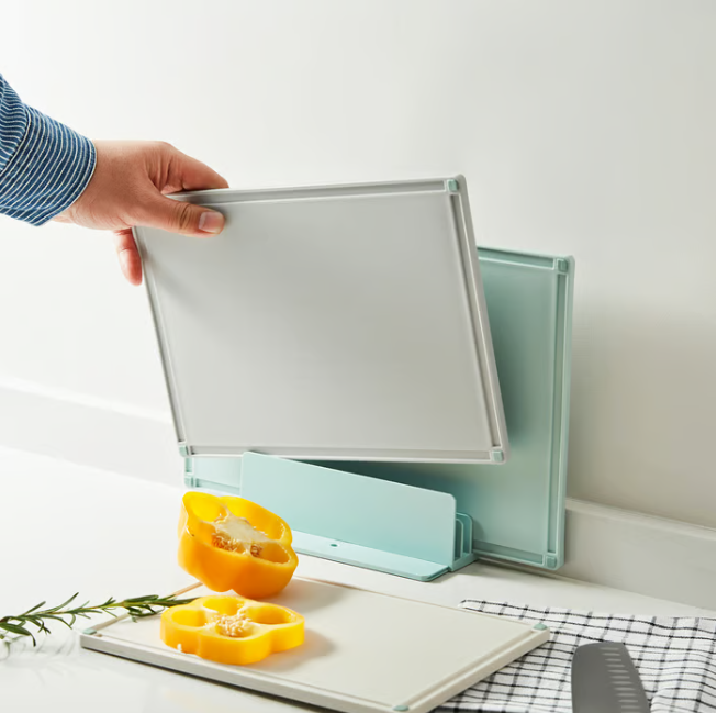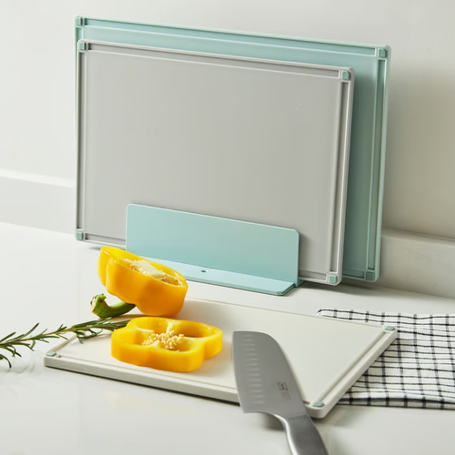 You can store the chopping boards upright in the included holder, which saves space on the kitchen worktop and makes them easy to reach.