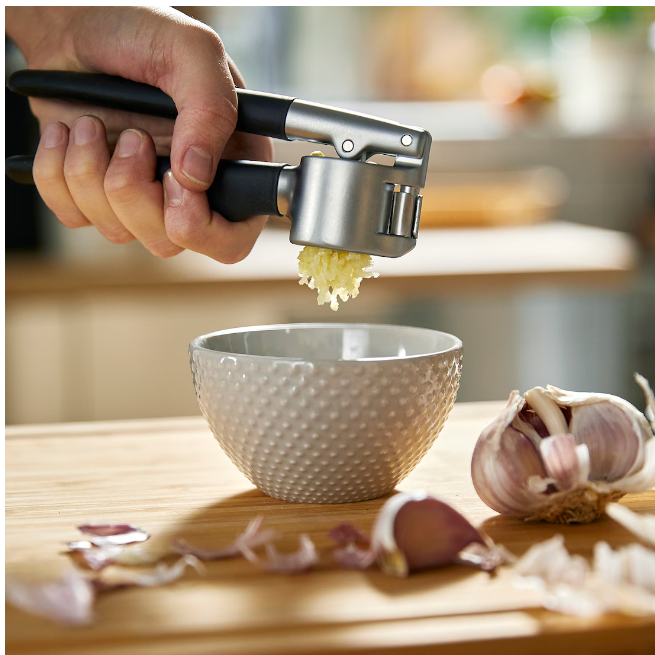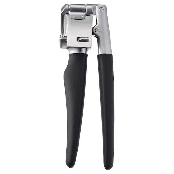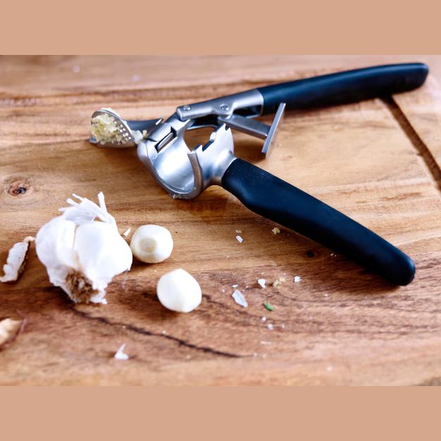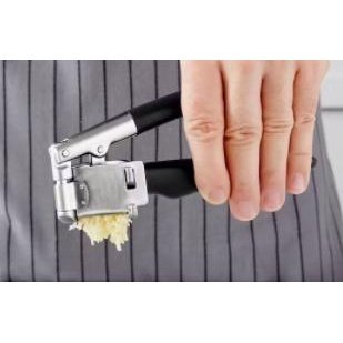 The garlic chamber is designed with a flat opening for easy cleaning and can handle unpeeled cloves. The handle is made of a firm-grip, synthetic rubber material and the body is crafted from zinc with a matte chrome-plated finish.