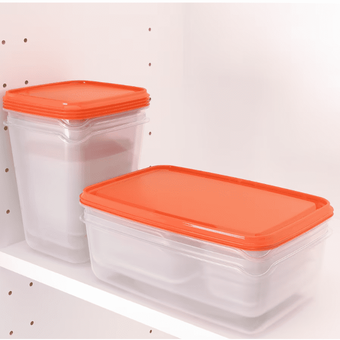 Maximize kitchen space with this set of 17 transparent and orange food containers. Easily stack them for efficient storage in your cabinets, fridge, or freezer and reduce food waste by storing leftovers for a future meal. The transparent design allows for easy identification of contents, no matter where they are placed in your kitchen.