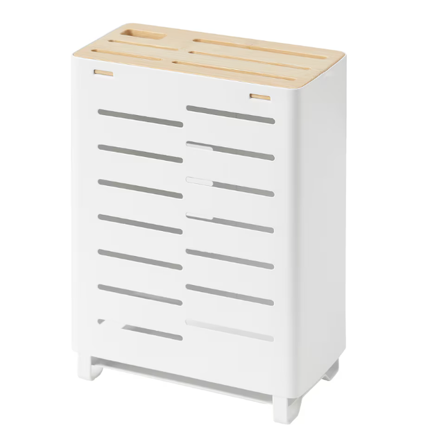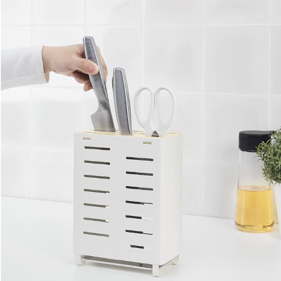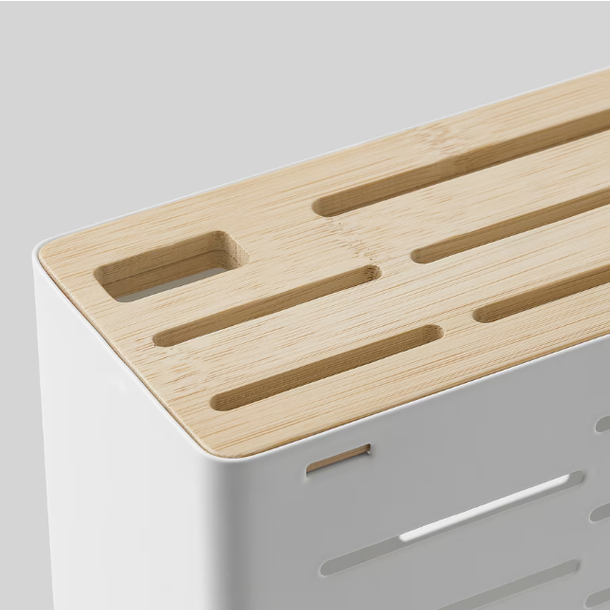 The knife holder has a simple expression in white and bamboo that fits nicely in all kitchens, regardless of style.