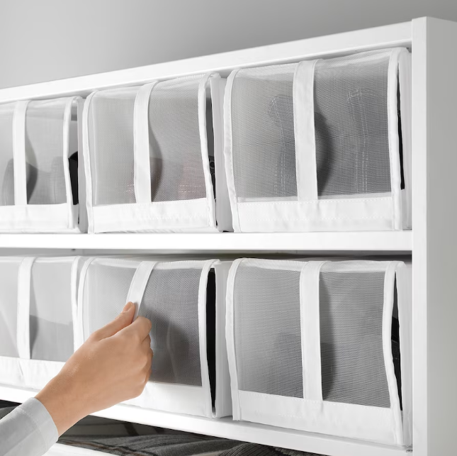 The fabric used in this product is made of recycled polyester, representing our commitment to a more sustainable future. The mesh window allows for visibility of the shoes inside the box, and the hook and loop fastener ensures easy opening and closing. This shoe box can also be folded flat and stored away when not in use, making it a practical addition to any wardrobe. Additionally, four boxes of this size can fit perfectly side by side in a 100 cm wide wardrobe frame.